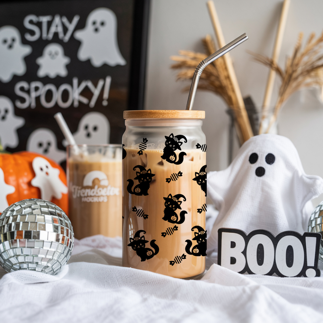 Verre à café glacé chats noirs et bonbons, Verre Libbey Halloween