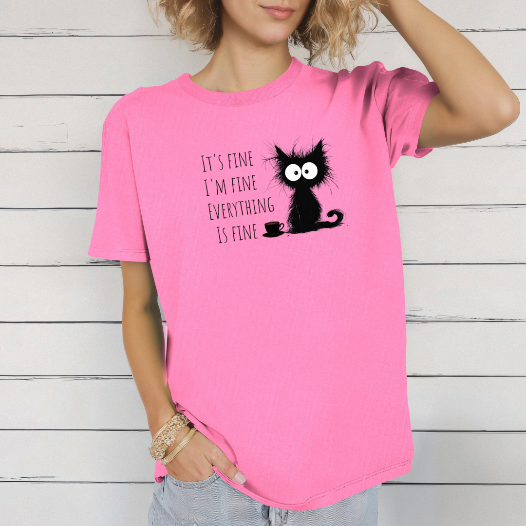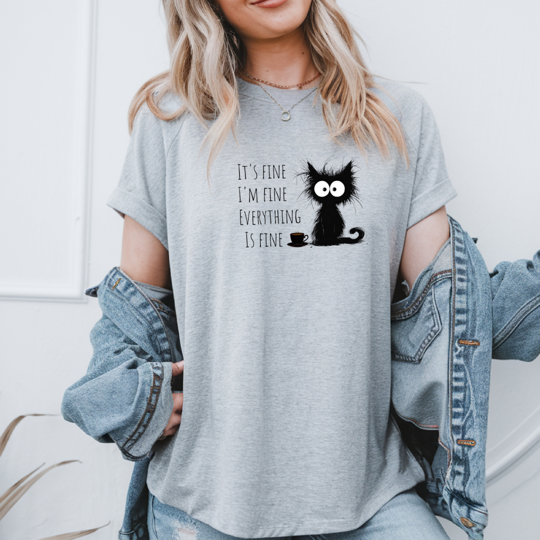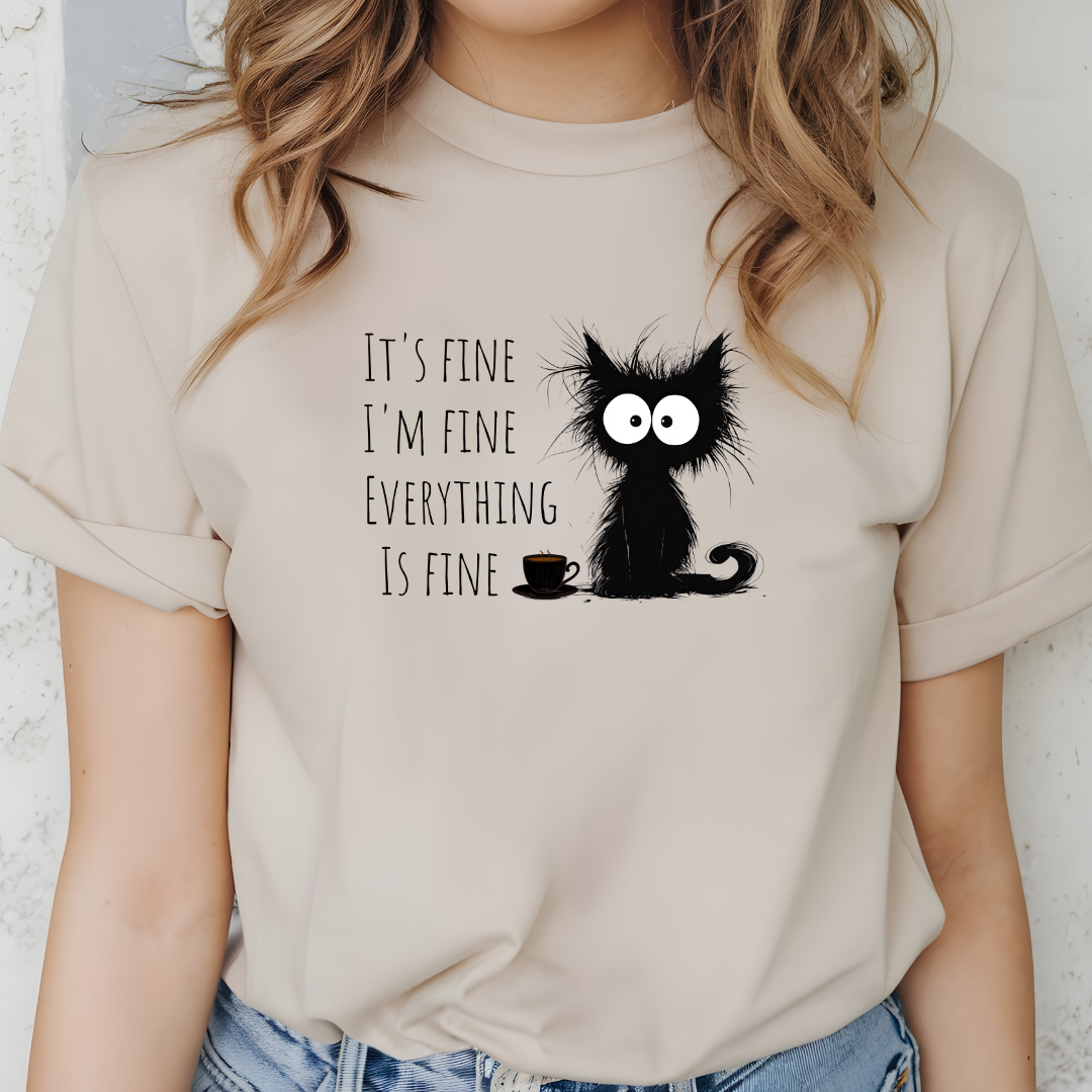 Add a touch of humor to your wardrobe with this funny black cat sweater with a sarcastic quote. Perfect for cat lovers and coffee lovers who sometimes experience... complicated mornings! Its unique design with a ruffled cat and the text "It's okay, I'm fine, everything's fine" makes it a unique and funny gift.