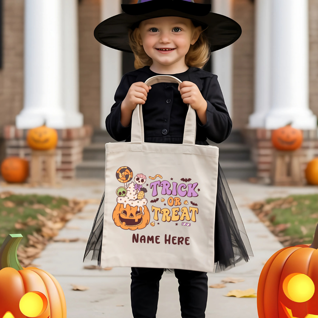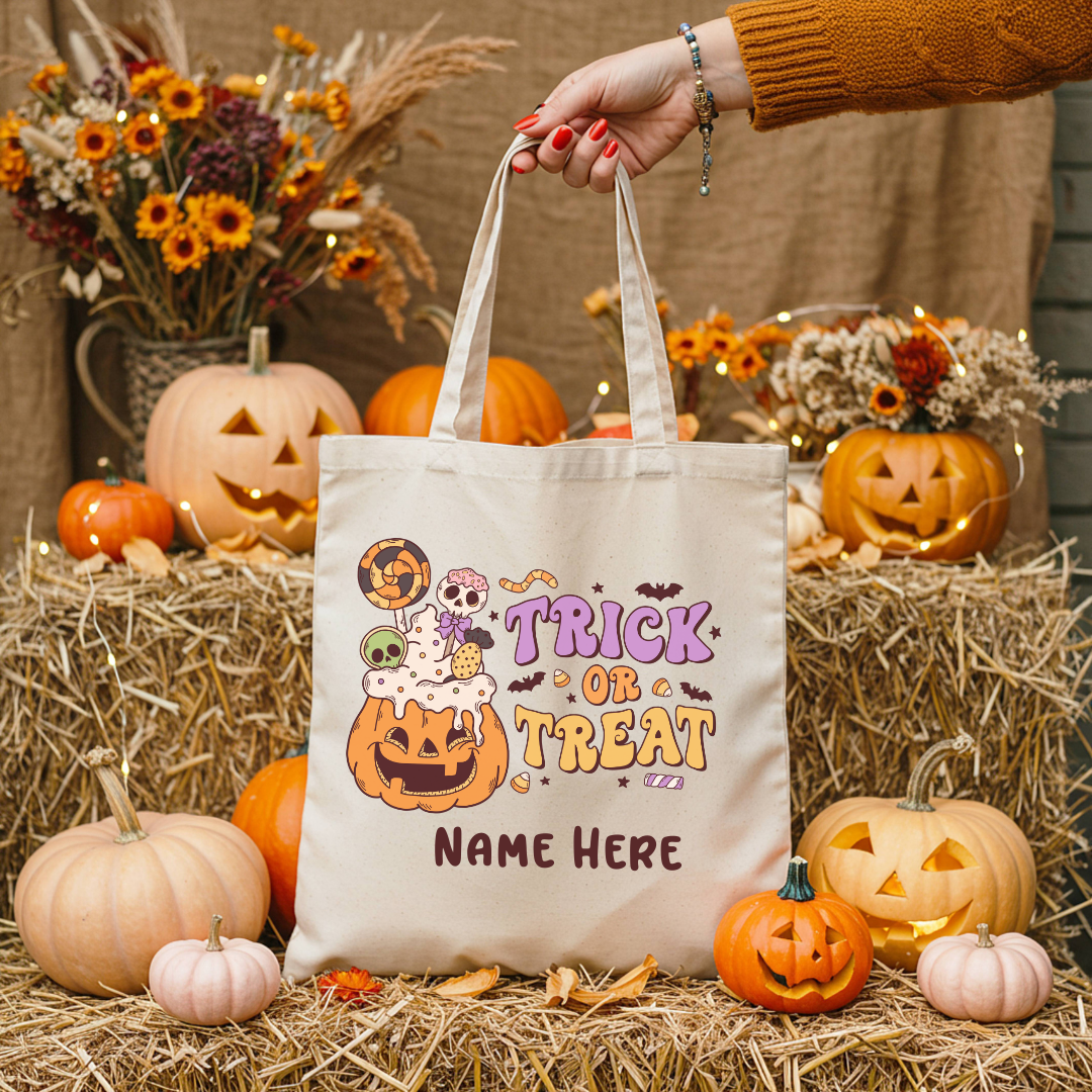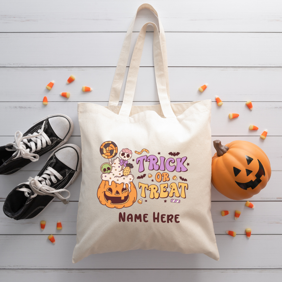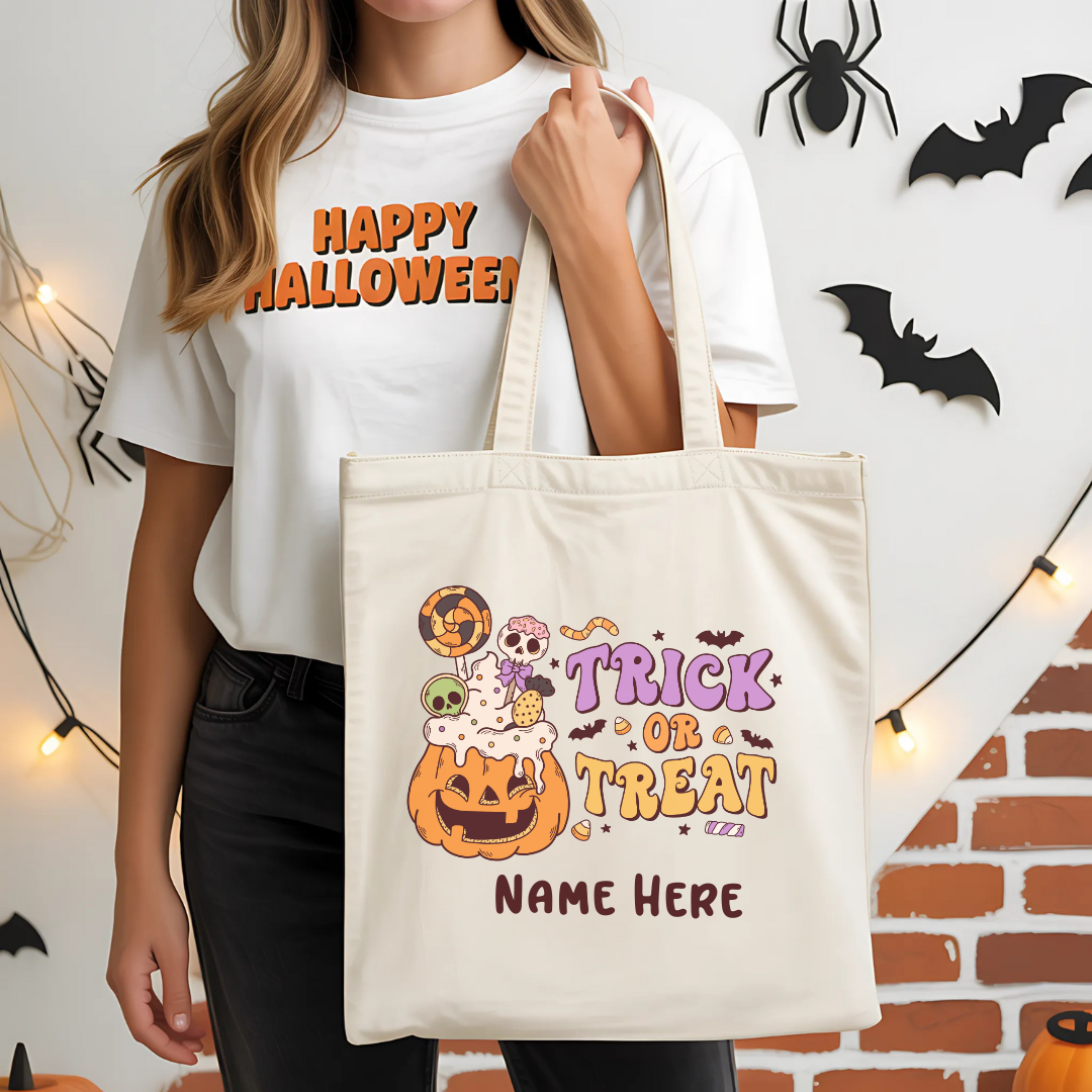 Check out our personalized Trick or Treat tote bag that's perfect for Halloween! Perfect for collecting Halloween treats, this Halloween tote bag is both practical and adorable. Add a personal touch to this spooky season with a unique bag your kids will love!