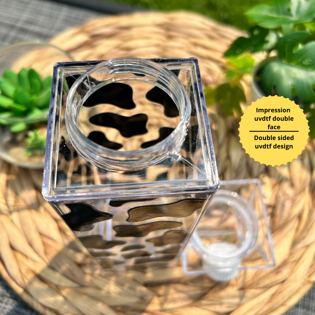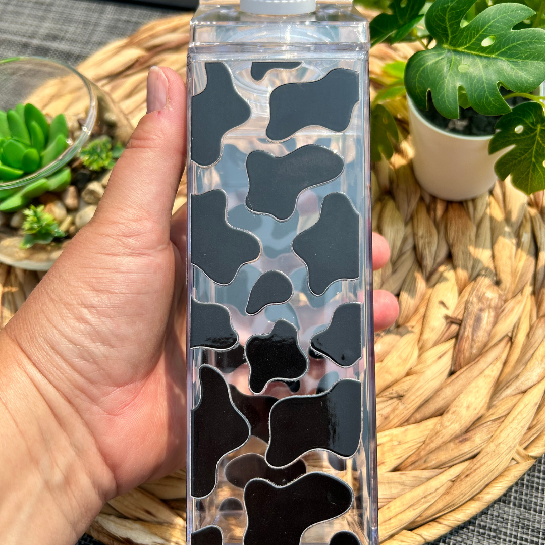 Bouteille style carton lait avec design de vache, Gobelet en plastique à motif de vache