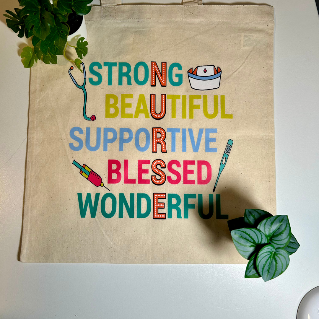 Un sac élégant et fonctionnel pour transporter tout ce dont une infirmière a besoin. Grandeur de 15 x 16 pouces en coton naturel.