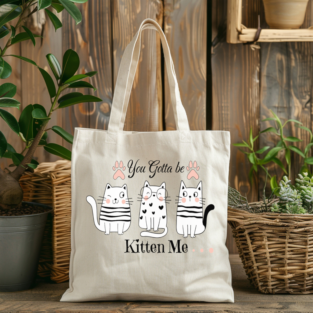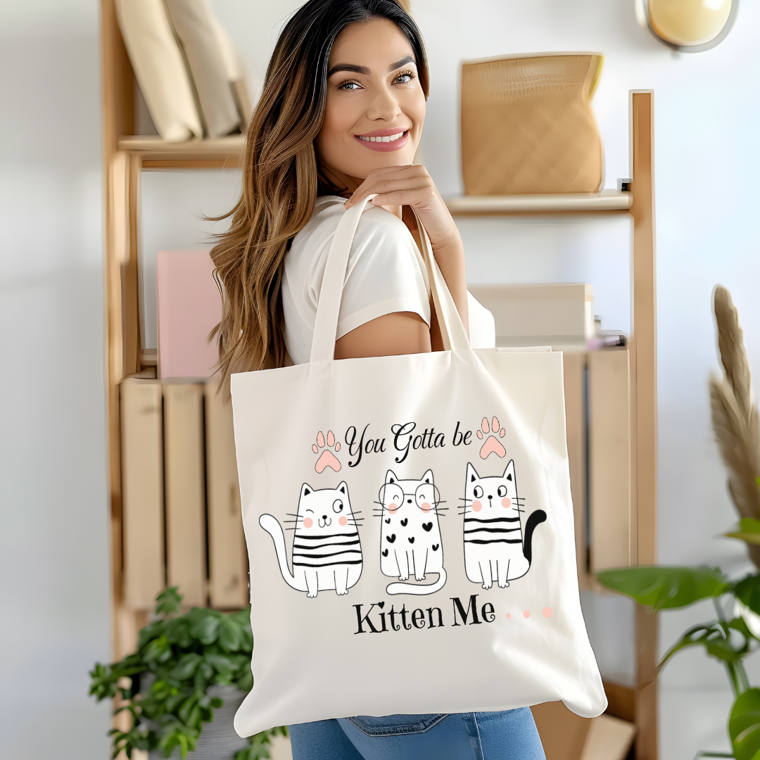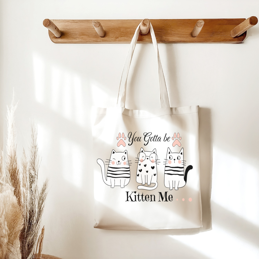 Faites miauler de rire votre quotidien avec ce tote bag en coton orné d’adorables chats au style cartoon et d’une citation pleine d’humour : "You Gotta Be Kitten Me" 🐱✨