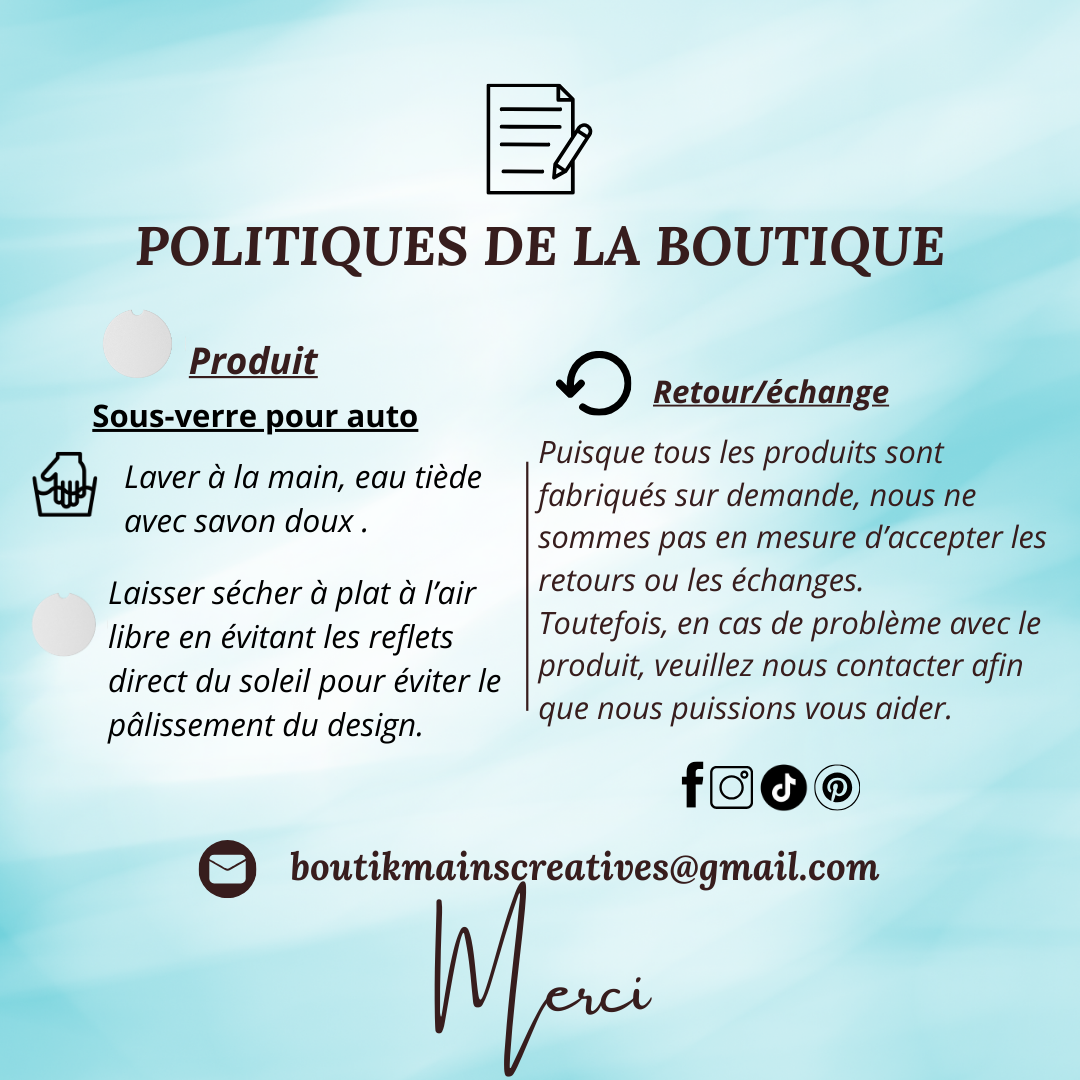 Veuillez garder à l'esprit que le design de chaque dessous de verre est fabriqué à la main et que son emplacement peut varier légèrement.