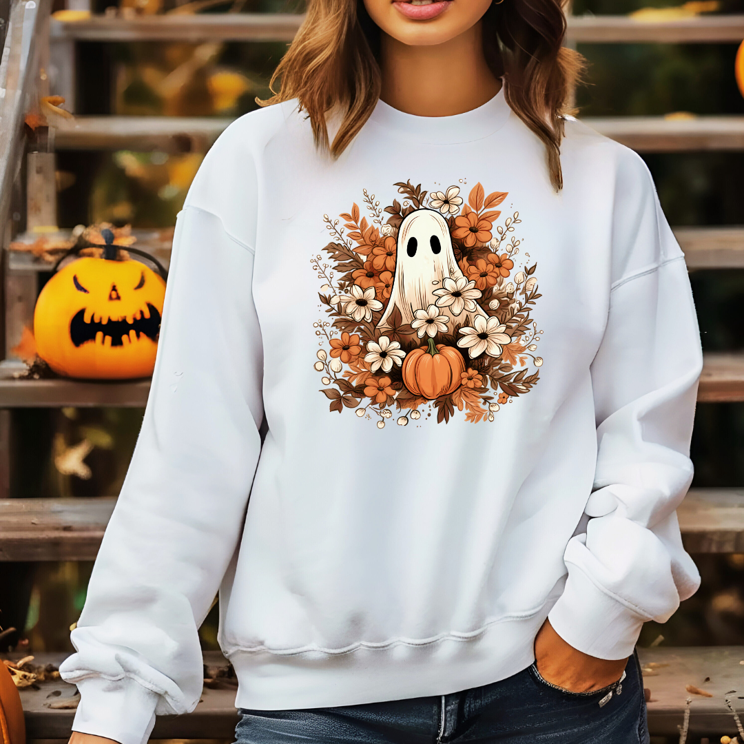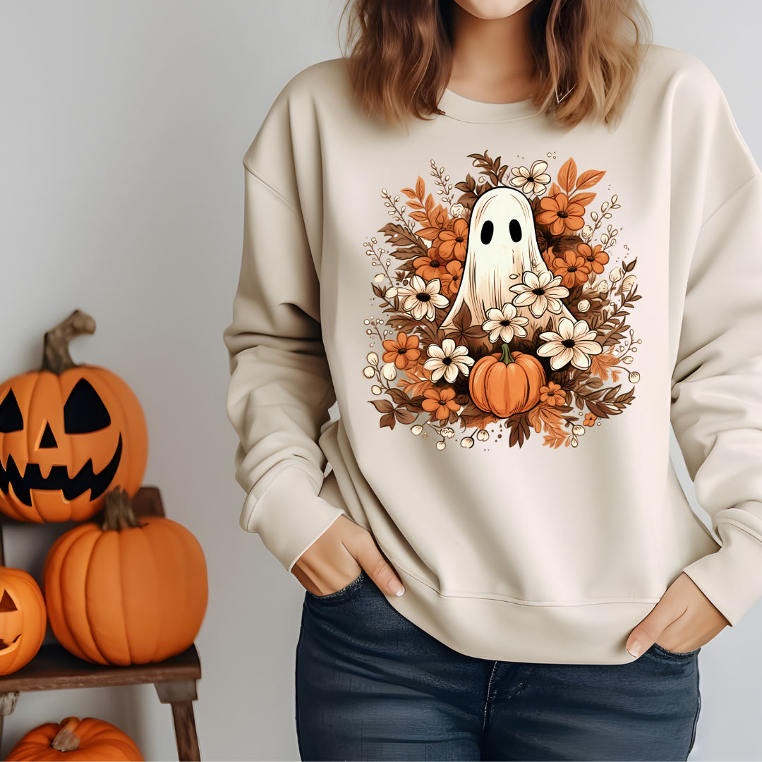 Revêtez-vous pour Halloween avec ce sweatshirt fantôme d'automne! Le design de fantôme se mélange parfaitement avec les fleurs d'automne, créant une tenue effrayante et élégante. Exprimez votre passion pour l'Halloween avec style.