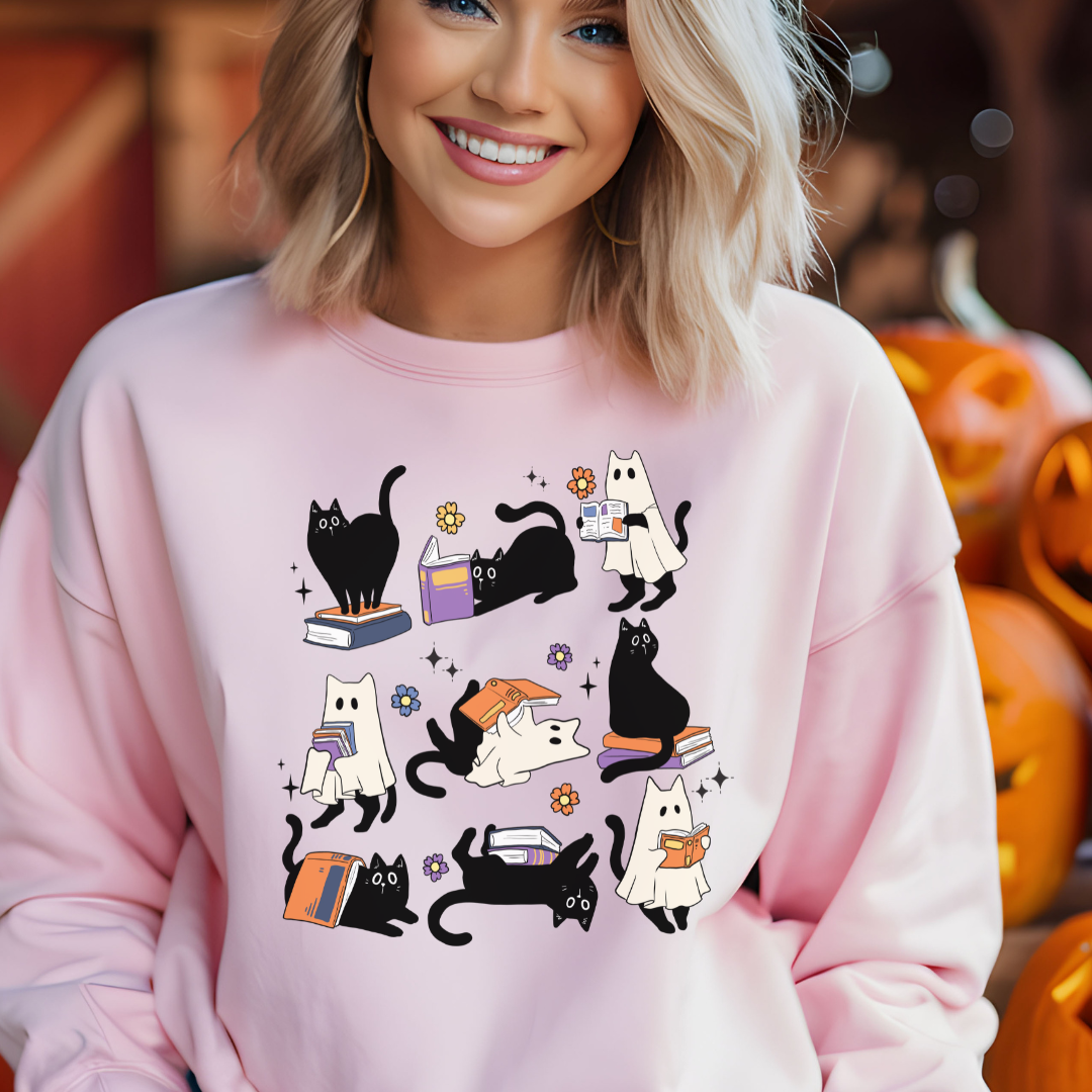 Sweatshirt Halloween Chat Fantôme et Livres, Cadeau pour amoureux des chats et livres