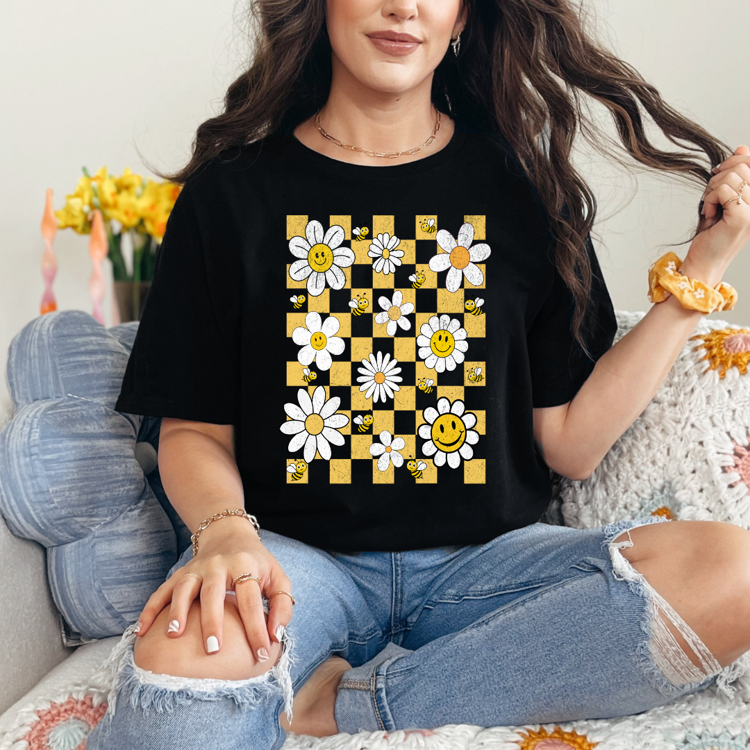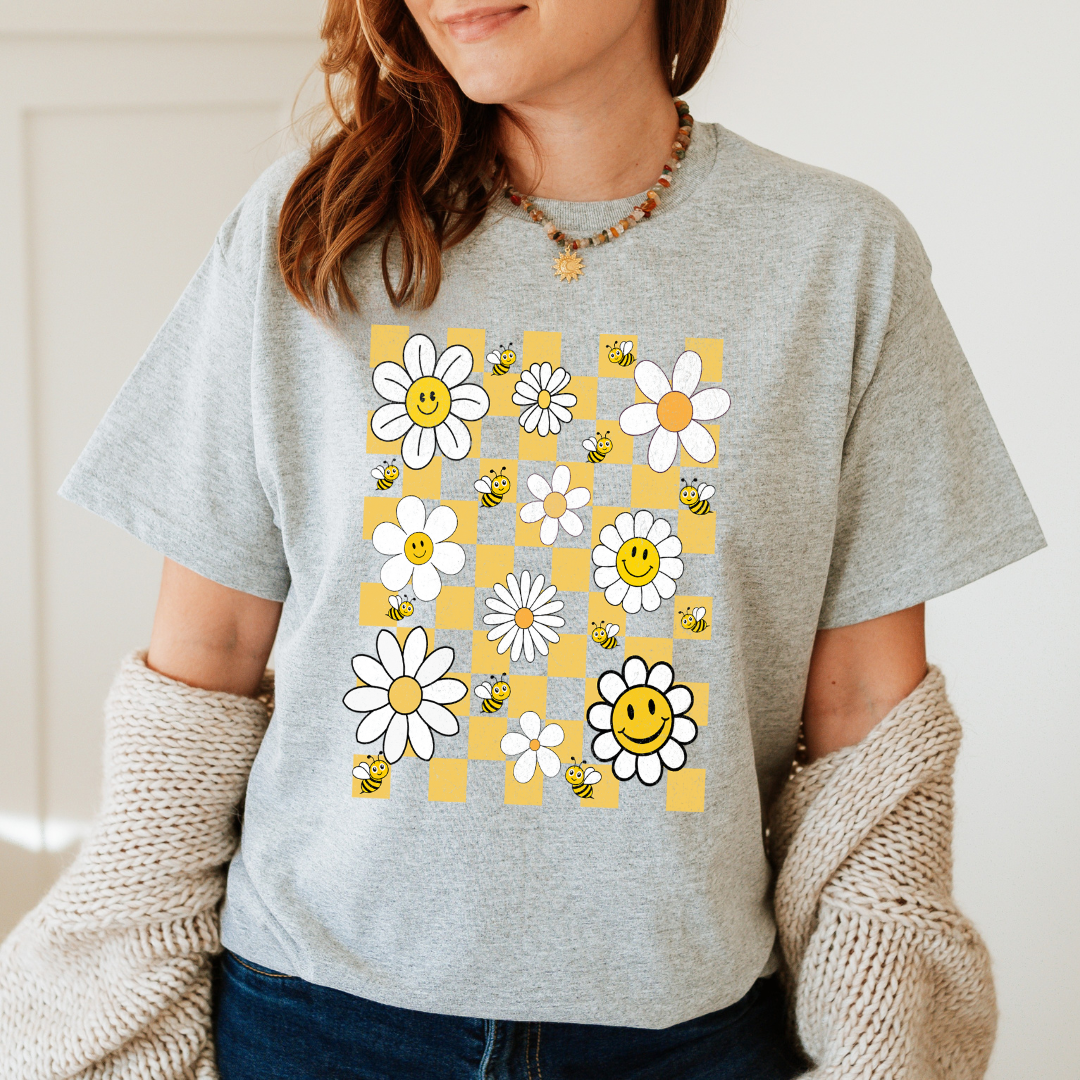T-shirt d'été rétro style grunge avec marguerites et abeilles, T-shirt floral