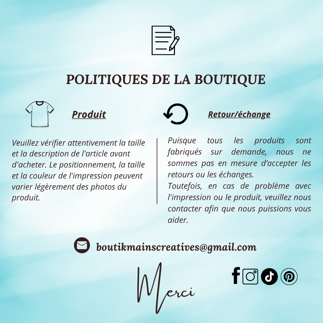 Les couleurs du texte et du design et/ou la couleur des chandails/sweatshirt peuvent varier légèrement de la photo présentée, en raison de l'éclairage, de l'impression et/ou des écrans d'ordinateur/téléphone.