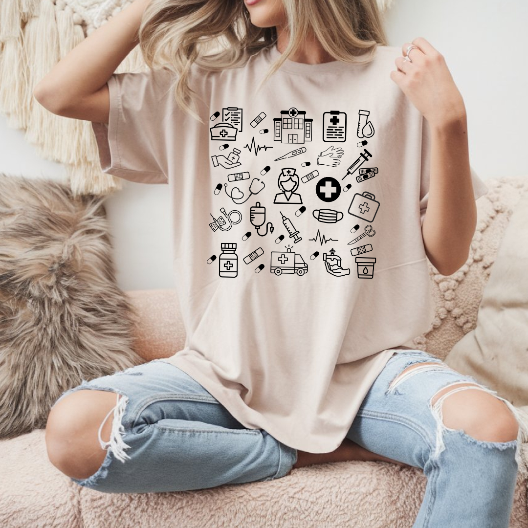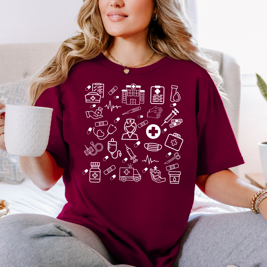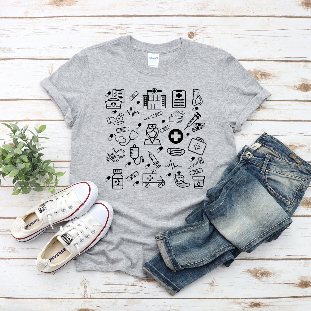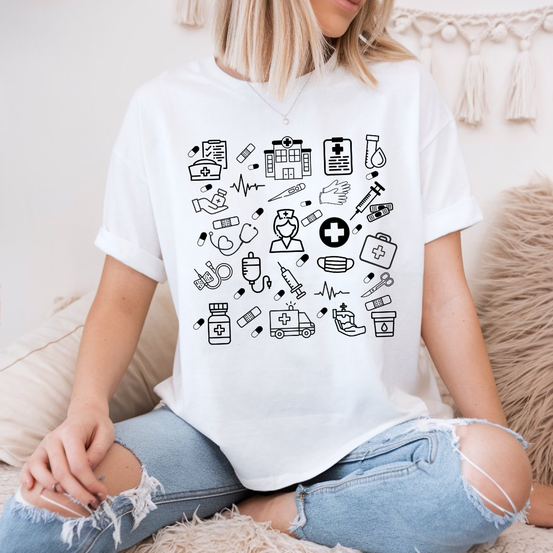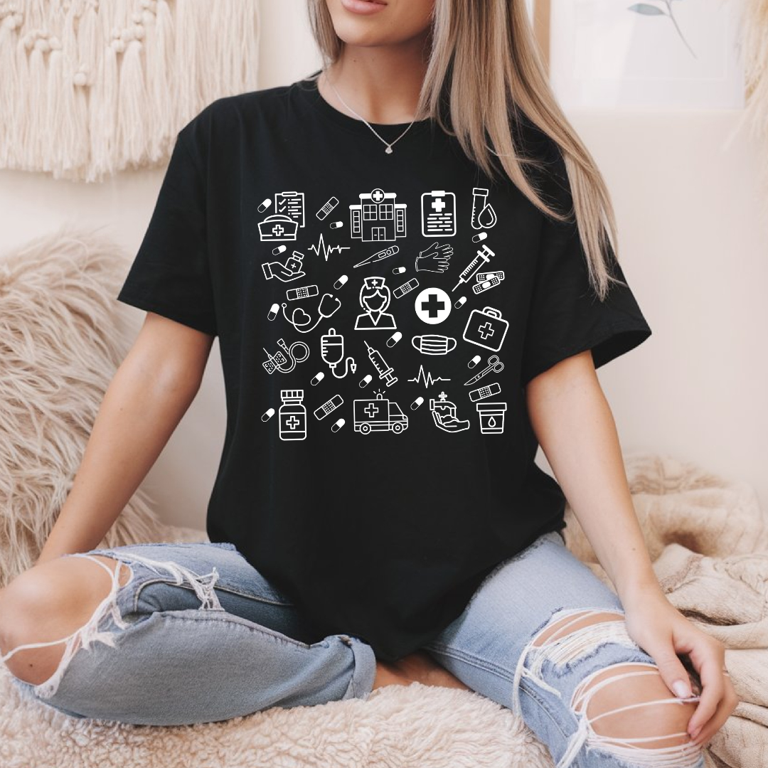 Affichez votre passion pour le domaine de la santé avec ce t-shirt unique illustrant des icônes médicales. Parfait pour les nouvelles infirmières, les étudiantes en soins infirmiers ou le personnel soignant !