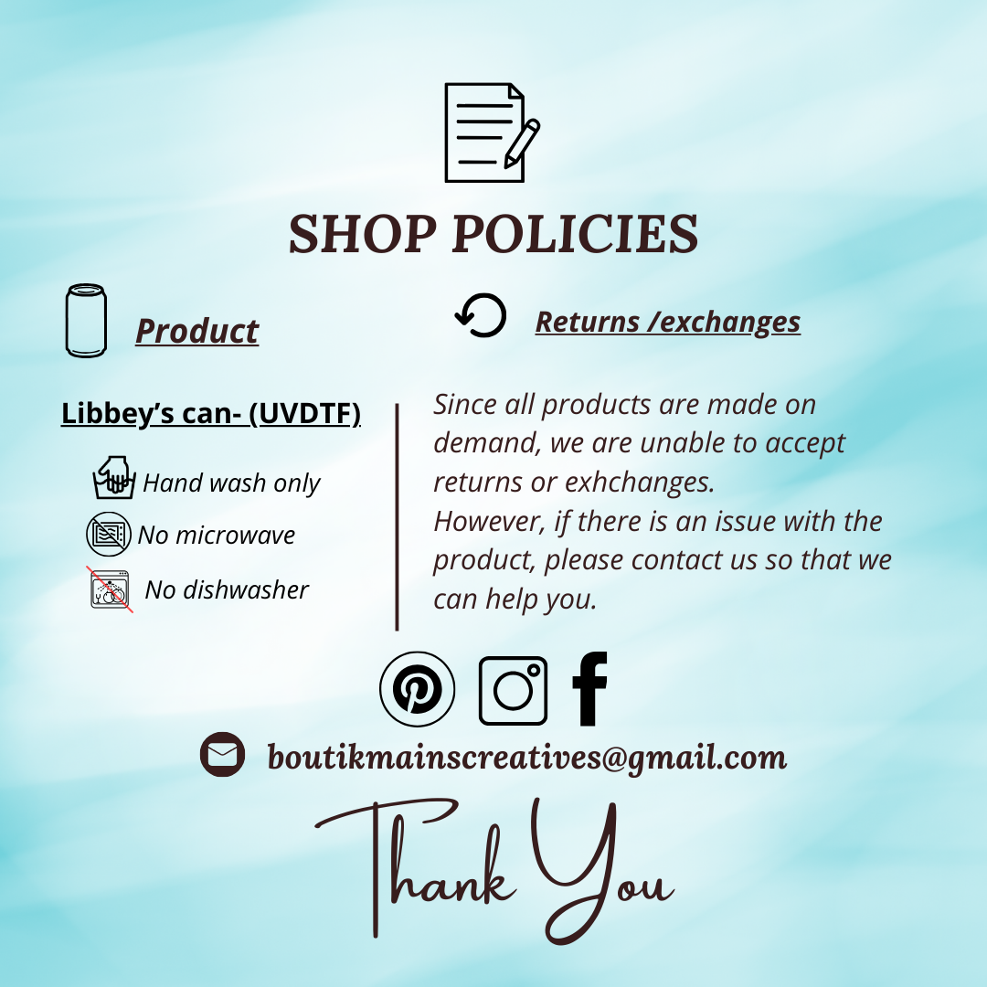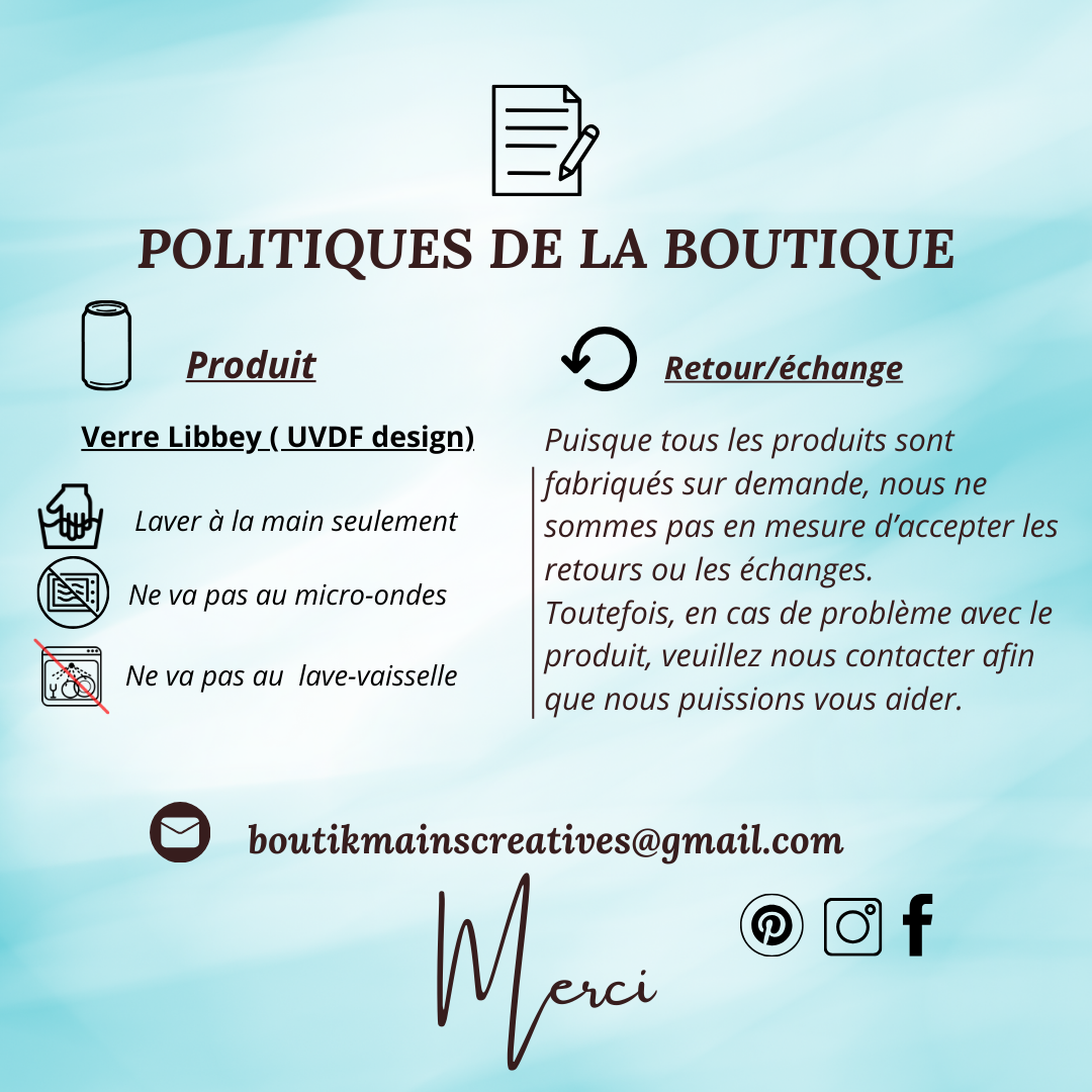 Tous les design sont conçues avec UVDTF, méthode offrant la possibilité d'imprimer des images de haute qualité avec des détails fins et une grande précision des couleurs et durabilité.