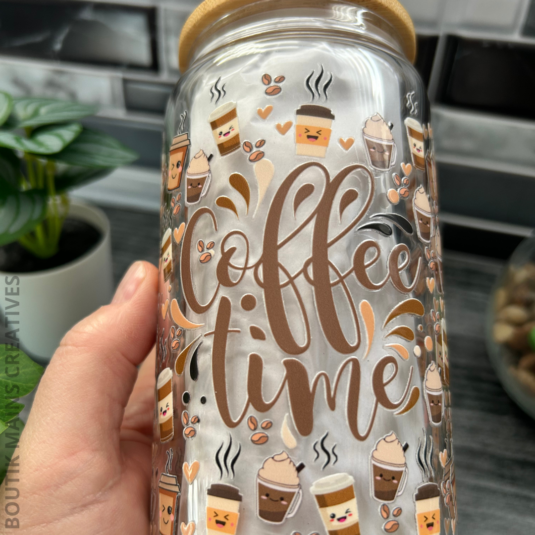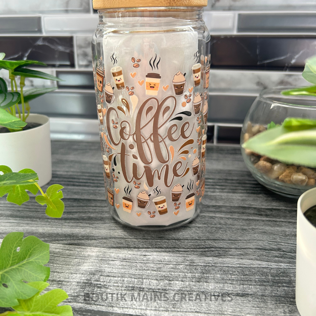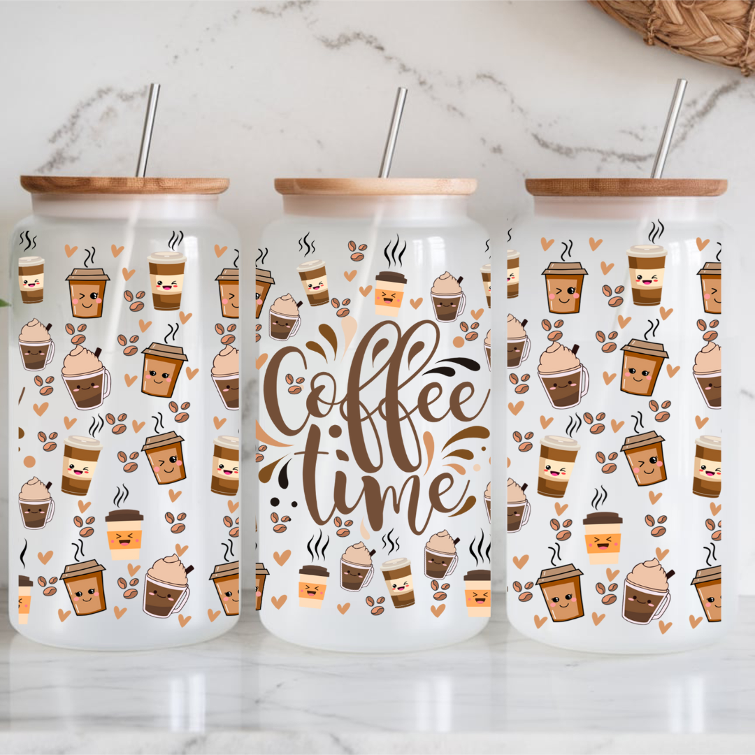 Profitez de votre café glacé avec style grâce à ce magnifique verre en verre 16 oz au design unique ! Illustré de tasses de café adorables et de la citation "Coffee Time", ce gobelet est parfait pour tous les amoureux du café.☕