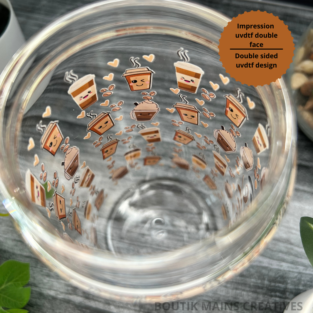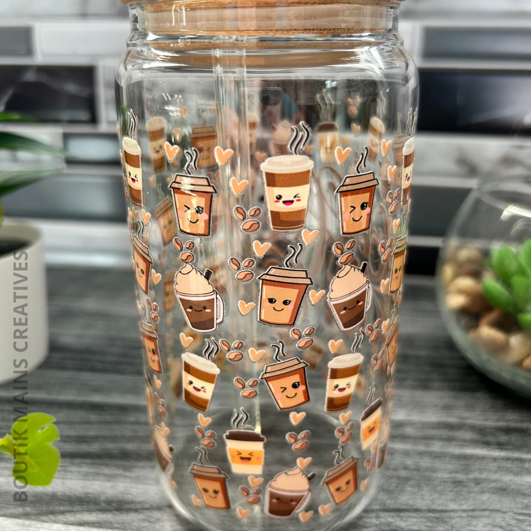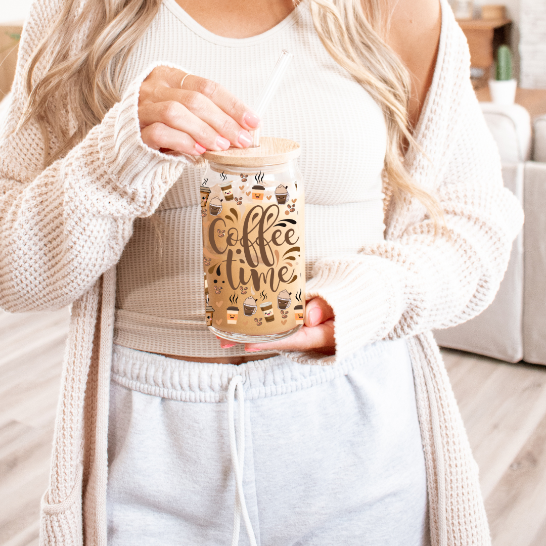 Profitez de votre café glacé avec style grâce à ce magnifique verre en verre 16 oz au design unique ! Illustré de tasses de café adorables et de la citation "Coffee Time", ce gobelet est parfait pour tous les amoureux du café.☕