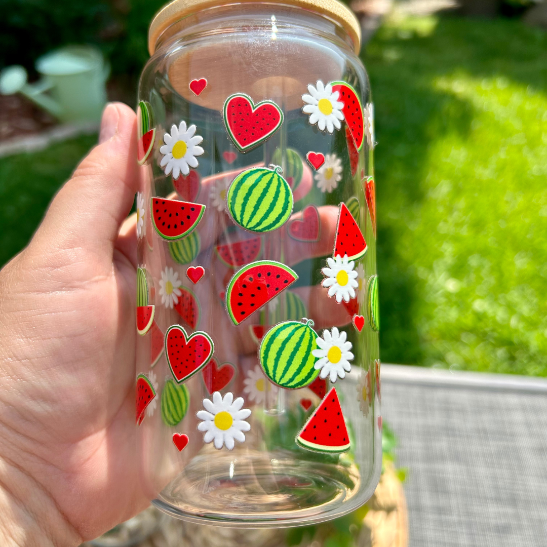 Verre à café glacé melon d'eau, Tasse pastèque et marguerites,